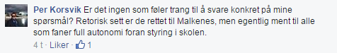 For det meste har boka vært en gjennomgang av ting jeg har hørt og lest før – og jeg jobber med meg selv ved å si at også dette er ideologisk (bare så mye lettere å være enig når det er min ideologi.) Altså – det meste jeg har lest i boka har gitt kognitiv resonnans og verken utfordret eller provosert meg, men jeg har heller ikke opplevd noe som oppklarende eller spesielt lærerikt. Før s.175. Det mest provoserende er hvordan noen som ikke har bakgrunn i skolen kan skrive så krystallklart om kjernen av skolekrigen. Her skriver Marsdal om kunnskapsystemer i konflikt, og om nødvendigheten av både den byråkratiske og den pedagogiske anskuelse: